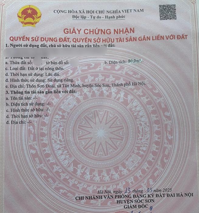 Khu vực: Huyện Sóc Sơn, Hà Nội Ngày: 08:20 | 24/03/2026 Giá: 1,650,000,000 Vnđ