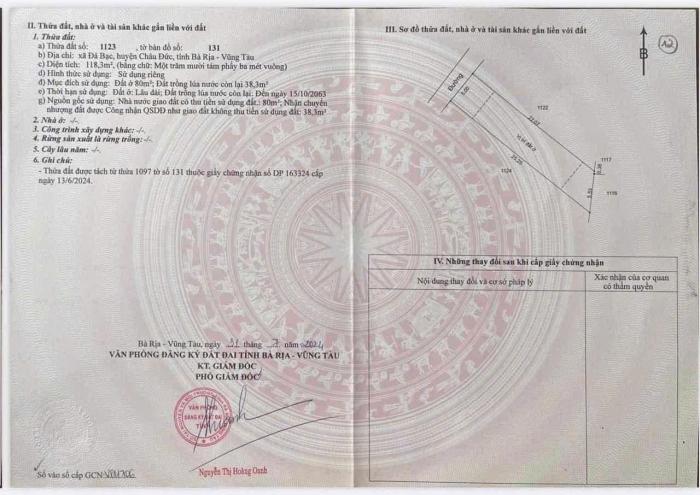Diện tích: 118 m2 Giá: 650,000,000 Vnđ Quận/Huyện: Huyện Châu Đức Tỉnh/Thành phố: Bà Rịa Vũng Tàu