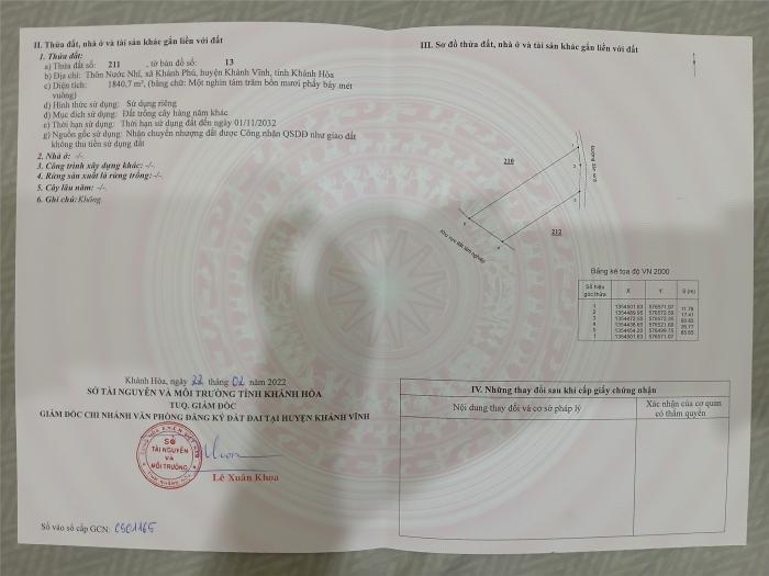 Diện tích: 1840 m2 Giá: 650,000,000 Vnđ Quận/Huyện: Huyện Khánh Vĩnh Tỉnh/Thành phố: Khánh Hòa