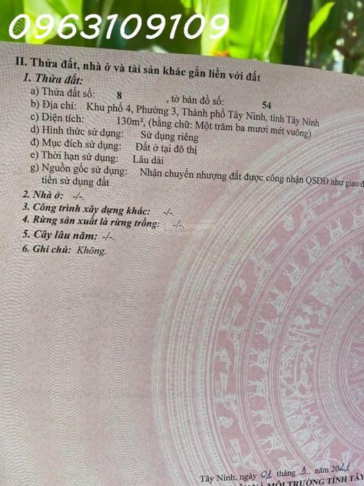 Diện tích: 130 m2 Giá: 2,100,000,000 Vnđ Quận/Huyện: Thành phố Tây Ninh Tỉnh/Thành phố: Tây Ninh