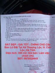 ĐẤT ĐẸP - GIÁ TỐT - CHÍNH CHỦ Cần Bán Lô Đất Tại Xã Thượng Lộc, H. Can Lộc, Hà Tĩnh Diện tích: 350 m2Giá bán: Làm việc chính chủ - Vị trí: gần chợ cách...