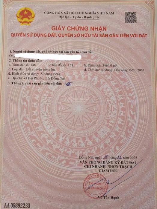 Khu vực: Huyện Nhơn Trạch, Đồng Nai Ngày: 11:42 | 07/01/2026 Giá: 12,480,000,000 Vnđ
