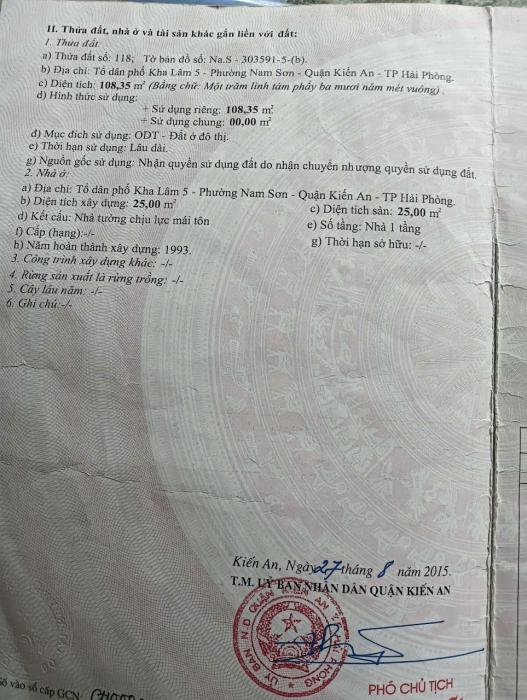 Diện tích: 108 m2 Giá: 1,000 Vnđ Quận/Huyện: Quận Kiến An Tỉnh/Thành phố: Hải Phòng