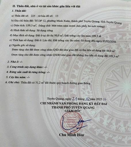 CHÍNH CHỦ BÁN MẢNH ĐẤT ĐẸP TẠI KHU TT THƯƠNG NGHIỆP CŨ - TP. TUYÊN QUANG * Địa chỉ: tổ 32, Phường Minh Xuân, TP. Tuyên Quang* Diện tích: 90m2 ( 5x18m ) - full thổ...