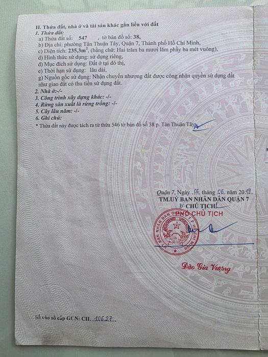 Diện tích: 235 m2 Giá: 20,500,000,000 Vnđ Quận/Huyện: Quận 7 Tỉnh/Thành phố: Hồ Chí Minh