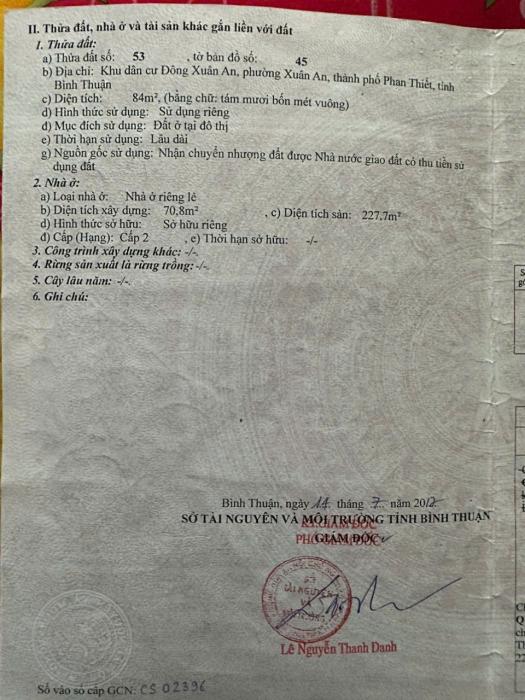 BÁN Nhà Khu Phố 3, Phường PhúTài, TP Phan Thiết Nay Thuộc Phường Bình Thuận, tỉnh Lâm Đồng Mới- Nhà 1 trệt 1 lầu, 3 phòng ngủ, 2 wc, 2 Bếp.- Diện tích: 85.9m2.-...