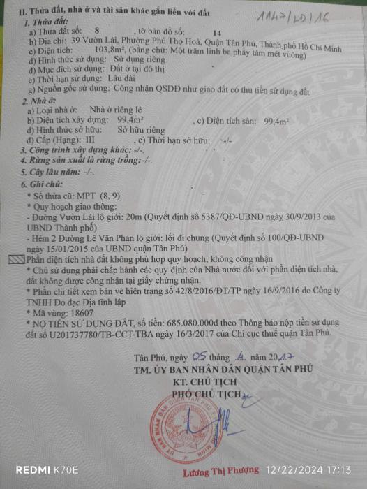Khu vực: Quận Tân Phú, Hồ Chí Minh Ngày: 19:59 | 13/01/2026 Giá: 6,990,000,000 Vnđ