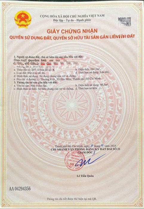 BÁN NHÀ ĐẤT MẶT TIỀN – HÓC MÔN Đường Lý Thường Kiệt – vị trí ngay bùng binh, cực đẹp Diện tích: 9m x 30m Sổ hồng riêng, pháp lý chuẩn Giá: 26 tỷ...