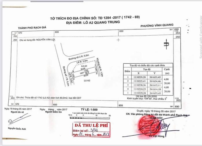 - Vị trí: Lô A2, đường Quang Trung, phường Vĩnh Quang, TP. Rạch Giá, Kiên Giang.* Tiện ích: - Đất nằm trong hẻm 333B Quang Trung, cách đầu hẻm vài trăm mét. -Đường trước đất rộng khoảng 5m, lề 3m, khu vực thông thoáng, thuận tiện đi lại.- Khu dân cư Đoàn Cải Lương, dân cư ổn định. - Đất đã có sẵn điện nước, xung quanh có nhà xây dựng sẵn. Phù hợp mua xây nhà ở hoặc đầu tư để dành cho con cái sau này.- Đầu tư sinh lời cao- Sổ Hồng Chính Chủ, Pháp Lý rõ ràng