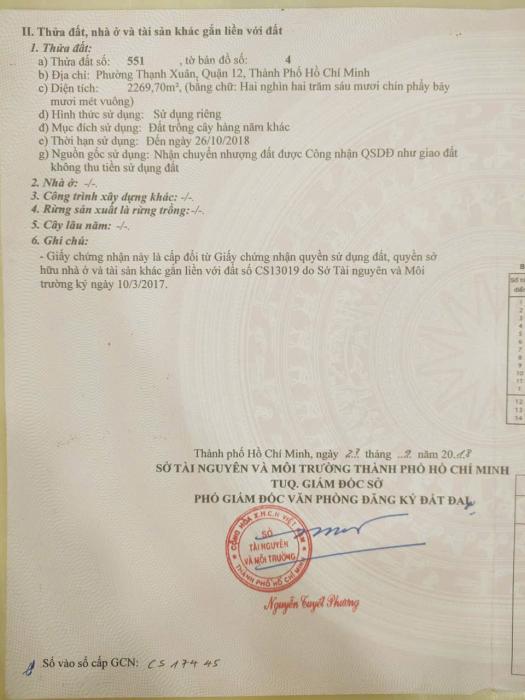 Diện tích: 2337 m2 Giá: 9,348,000,000 Vnđ Quận/Huyện: Quận 12 Tỉnh/Thành phố: Hồ Chí Minh