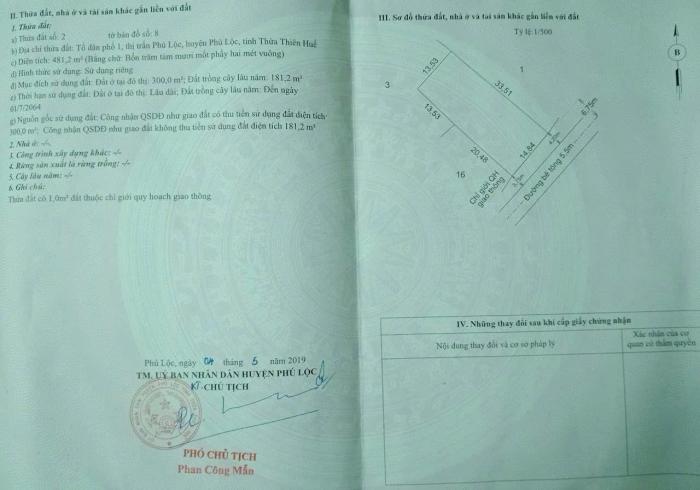 Diện tích: 481 m2 Giá: 6,734,000,000 Vnđ Quận/Huyện: Huyện Phú Lộc Tỉnh/Thành phố: Thừa Thiên Huế
