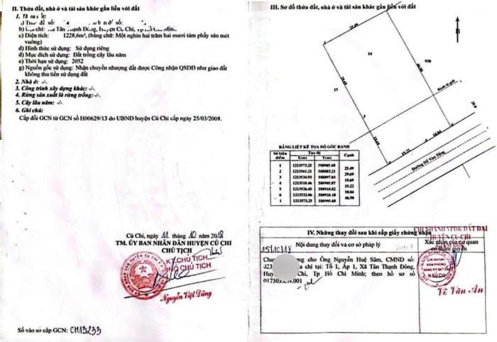 Diện tích: 1228 m2 Giá: 9,900,000,000 Vnđ Quận/Huyện: Huyện Củ Chi Tỉnh/Thành phố: Hồ Chí Minh