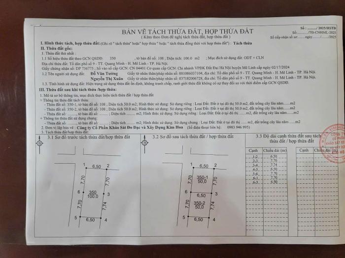 Chính chủ cần bán gấp thửa đất đẹp tại Tổ dân phố số 9, thị trấn Quang Minh (thôn Ấp Quan), Mê Linh, Hà Nội. • Diện tích: 69m2. Mặt tiền rộng 5.5m (thửa...