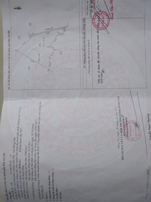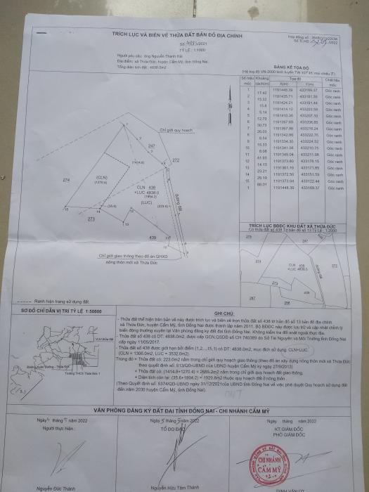 - Vị trí đất: Thuộc tờ bản đồ số 13 thửa đất 438 xã Thừa Đức, huyện Cẩm Mỹ, tỉnh Đồng Nai.- Mô tả: Đất cao ráo, trên đất hiện đang trồng điều, chuối và một số loại cây lâu năm khác