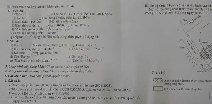 Diện tích: 100 m2 Giá: 7,700,000,000 Vnđ Quận/Huyện: Quận 12 Tỉnh/Thành phố: Hồ Chí Minh