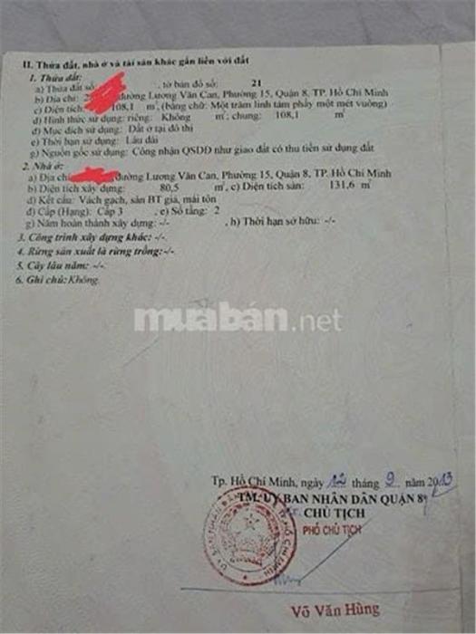 Diện tích: 108 m2 Giá: 5,900,000,000 Vnđ Quận/Huyện: Quận 8 Tỉnh/Thành phố: Hồ Chí Minh