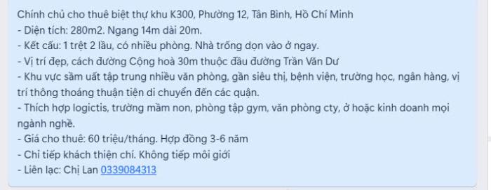 Diện tích: 280 m2 Giá: 60,000,000 Vnđ Quận/Huyện: Quận Tân Bình Tỉnh/Thành phố: Hồ Chí Minh
