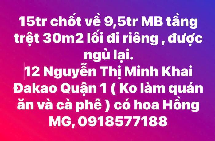 Diện tích: 30 m2 Giá: 9,500,000 Vnđ Quận/Huyện: Quận 1 Tỉnh/Thành phố: Hồ Chí Minh