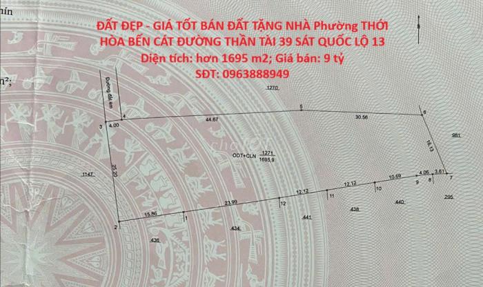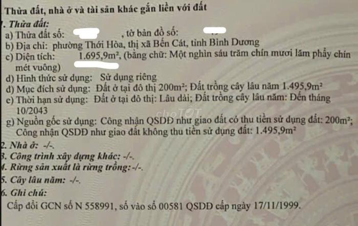 Diện tích: 1695 m2 Giá: 9,000,000,000 Vnđ Quận/Huyện: Thị xã Bến Cát Tỉnh/Thành phố: Bình Dương