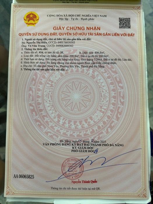 Địa chỉ: Tổ dân phố Nam Yên, Xã Hoà Bắc, Huyện Hoà Vang, Đà Nẵng (nay là phường Hải Vân, TP Đà Nẵng)Diện tích : 400,8 m2. ( trong đó có 200m2 đất ở tại đô thị, 200,8m2 đất HNK), Ngang trên 13m.Giá bán: 3,5 tỷ ( có thương lượng)Tiện ích : - Đường 5m5, có vỉa hè trước đất.- Thích hợp làm biệt thự nhà vườn. - View đồi núi và view sông Cu đê. - Nằm gần tổ hợp các khu du lịch mới của Đà Nẵng như: Nam Yên Homstay, Làng Mê, An Yen Garden, Hoà Bắc ecologde… - Tiềm năng phát triển du lịch trong tương lai, đầu tư sinh lời cao. - Giao thông thuận tiện - Pháp lý: đầy đủ, thủ tục sang tên nhanh chóng - Tiềm năng lớn, đảm bảo sinh lời cao Mọi nhu cầu liên hệ : Số điện thoại 0774837772