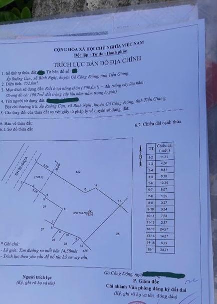 Diện tích: 752 m2 Giá: 2,350,000,000 Vnđ Quận/Huyện: Huyện Gò Công Tây Tỉnh/Thành phố: Tiền Giang