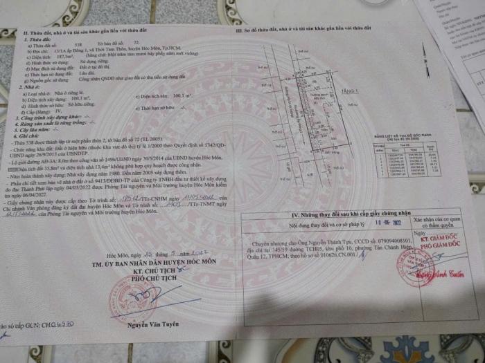 Diện tích: 187 m2 Giá: 6,500,000,000 Vnđ Quận/Huyện: Huyện Hóc Môn Tỉnh/Thành phố: Hồ Chí Minh