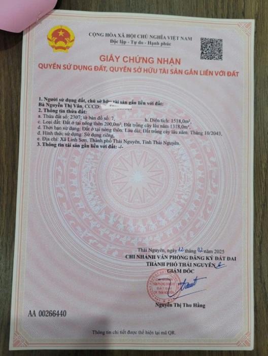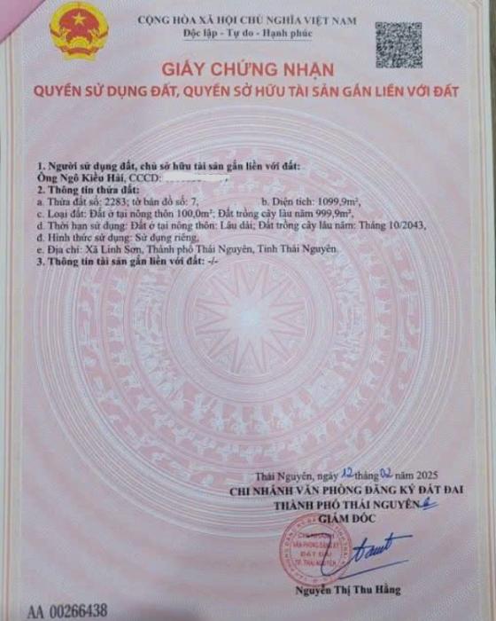 Cần bán lô đất Trung Thành – . Thái Nguyên (gần Sóc Sơn, Hà Nội chỉ 1,5km) Diện tích: khoảng 500m² Mặt tiền 8m, ngay Quốc lộ 3 Có 130m² đất trồng cây lâu...
