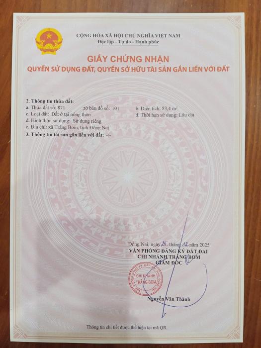 Khu vực: Huyện Trảng Bom, Đồng Nai Ngày: 10:58 | 11/01/2026 Giá: 6,500,000,000 Vnđ