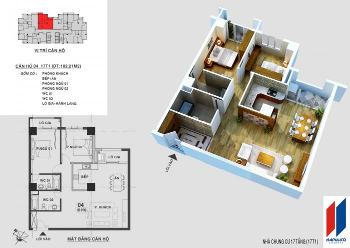 Nội thất căn hộ: Sàn gỗ, trần thạch cao, điều hòa Daikin (mỗi phòng 1 cái), bình nóng lạnh, tủ bếp, bếp ga, máy hút mùi, tủ giầy, camera cửa...Thang máy tốc độ cao nhập khẩu của Mitsubishi