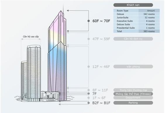+ Tầng 60-70: khách sạn cao cấp quản lý bởi tập đoàn đa quốc gia Inter Continental