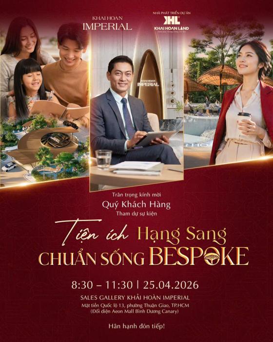 ✨CHỦ ĐỀ: TIỆN ÍCH HẠNG SANG – CHUẨN SỐNG BESPOKE✅ Thời gian: 08:30 – 11:30 25.04.2026✅ Địa điểm: Sales Gallery Khải Hoàn Imperial (Đối diện Aeon Mall Bình Dương).✅ Nội dung chia sẻ:+ Triết lý Bespoke tại Khải Hoàn Imperial+ Hệ tiện ích hạng sang chuẩn Bespoke đầu tiên tại TP HCM