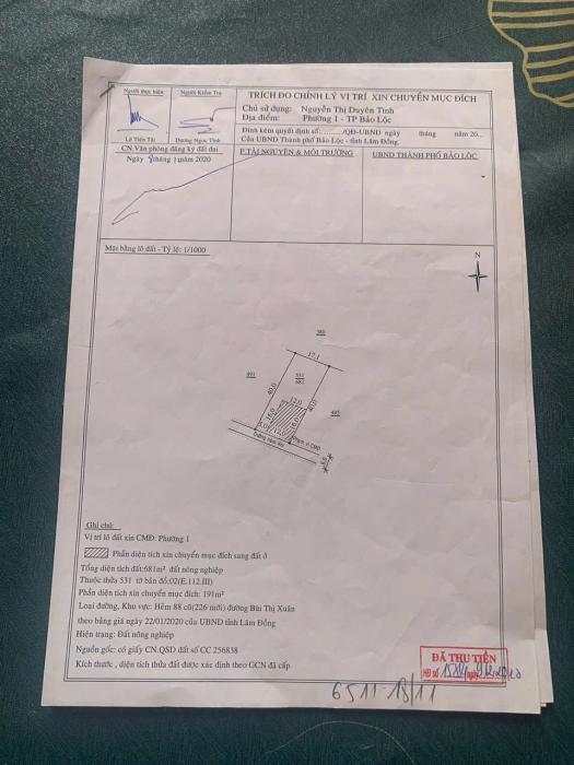 Diện tích: 680 m2 Giá: 7,500,000,000 Vnđ Quận/Huyện: Thành phố Bảo Lộc Tỉnh/Thành phố: Lâm Đồng