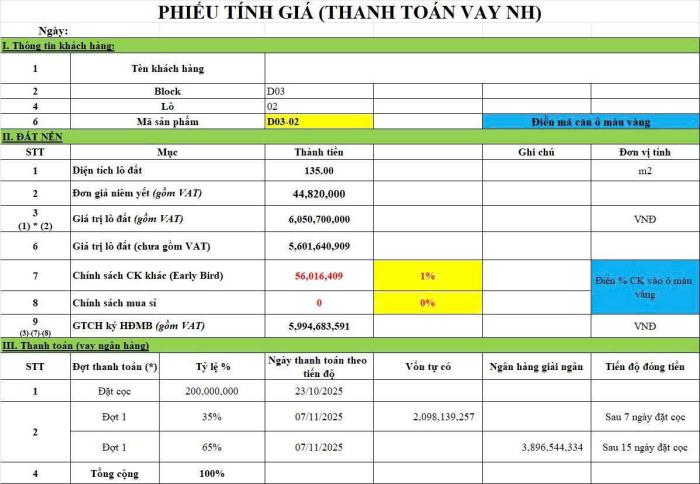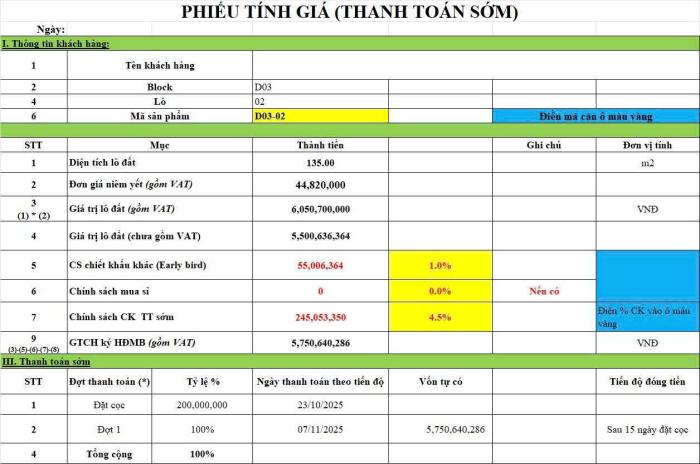 * Mã sản phẩm: D03-02* Diện tích: 135 m²* Đơn giá niêm yết (đã gồm VAT): 44,820,000 VNĐ/m²* Tổng giá trị lô đất (gồm VAT): 6,050,700,000 VNĐ- Ưu đãi thanh toán sớm – Chiết khấu 4.5%- Giảm ngay: 245,053,350 VNĐ khi thanh toán sớm