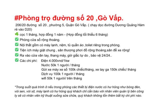 Diện tích: 30 m2 Giá: 2,800,000 Vnđ Quận/Huyện: Quận Gò Vấp Tỉnh/Thành phố: Hồ Chí Minh