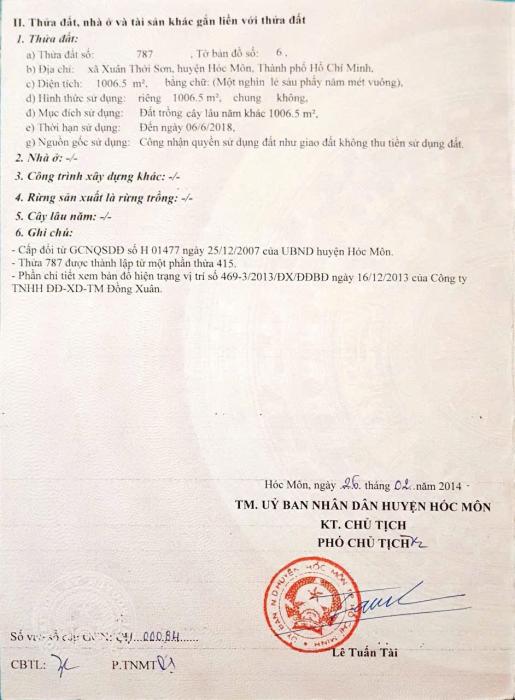 Diện tích: 1106 m2 Giá: 8,000,000,000 Vnđ Quận/Huyện: Huyện Hóc Môn Tỉnh/Thành phố: Hồ Chí Minh
