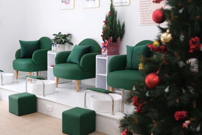→ *Quy mô:* 3 tầng với tổng diện tích hơn 180m²+ Tầng trệt: 80m²+ Tầng 1: 50m²+ Tầng 2: 50m²→ *Trang bị đầy đủ:*+ Tầng trệt:– 3 ghế nail– 2 bàn dũa đầu đủ đèn, sơn, máy mài, …– 4 ghế tóc– 2 ghế gội xả tóc– Đầy đủ kính, tủ, hóa chất, máy kích nhiệt, máy hấp dầu+ Tầng 1:– 4 giường gội có bồn sứ, vòm nước, xe đẩy, máy hấp, tai thỏ, …– 1 phòng có sẵn kệ tủ, ghế wax – phun xăm+ Tầng 2:– 3 giường chăm sóc da– Máy phun hơi, máy điện di, máy điện cam, …