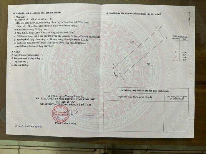 CẦN TIỀN BÁN GẤP LÔ ĐẤT TAM ĐẢO – GIÁ TỐT CHO KHÁCH THIỆN CHÍ * Diện tích: 102 m² - 50 m² đất thổ cư - 52 m² đất trồng cây lâu năm - Thửa đất số: 448...