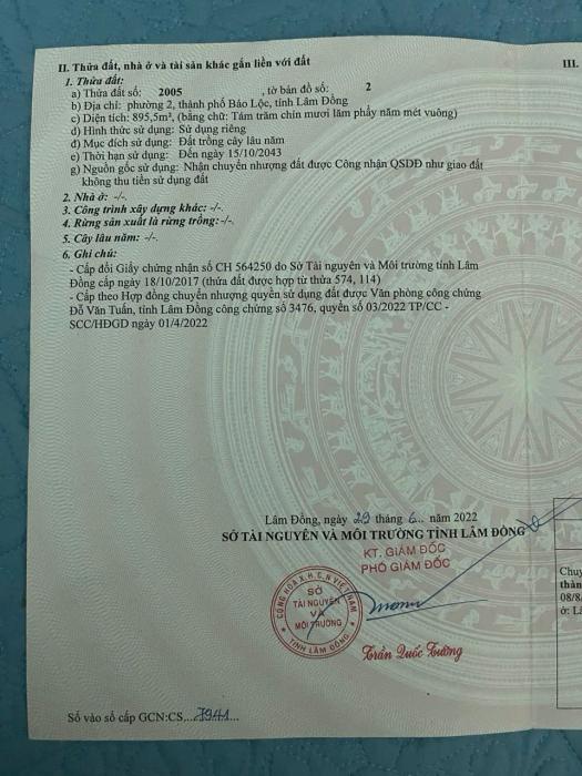 Diện tích: 895 m2 Giá: 7,000,000,000 Vnđ Quận/Huyện: Thành phố Bảo Lộc Tỉnh/Thành phố: Lâm Đồng