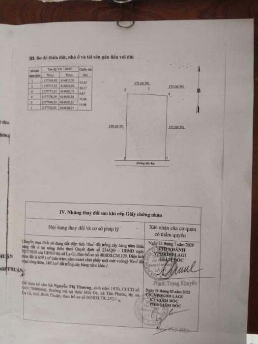 Diện tích: 20m x 33m – sổ hồng rõ ràng, đường ô tô vào tận đất.Vị trí: Lô 2, đường Nguyễn Du, phường Phước Hội, thị xã La Gi, tỉnh Bình Thuận.Đường bê tông 4m, cách đường Nguyễn Du chỉ 50m, cách biển Cam Bình 500m.