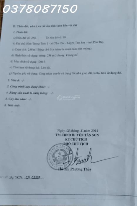 Diện tích: 238 m2 Giá: 4,500,000,000 Vnđ Quận/Huyện: Huyện Tân Sơn Tỉnh/Thành phố: Huyện Phúc Thọ