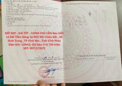ĐẤT ĐẸP - GIÁ TỐT - CHÍNH CHỦ CẦN Bán GẤP Lô Đất Tiềm Năng Tại ĐỊNH TRUNG - VĨNH YÊN.ĐỊA CHỈ : KDC Đồi Chiêu Đãi , Xã Định Trung , TP Vĩnh Yên , Tỉnh Vĩnh...