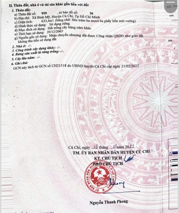 Diện tích: 634 m2 Giá: 4,550,000,000 Vnđ Quận/Huyện: Huyện Củ Chi Tỉnh/Thành phố: Hồ Chí Minh